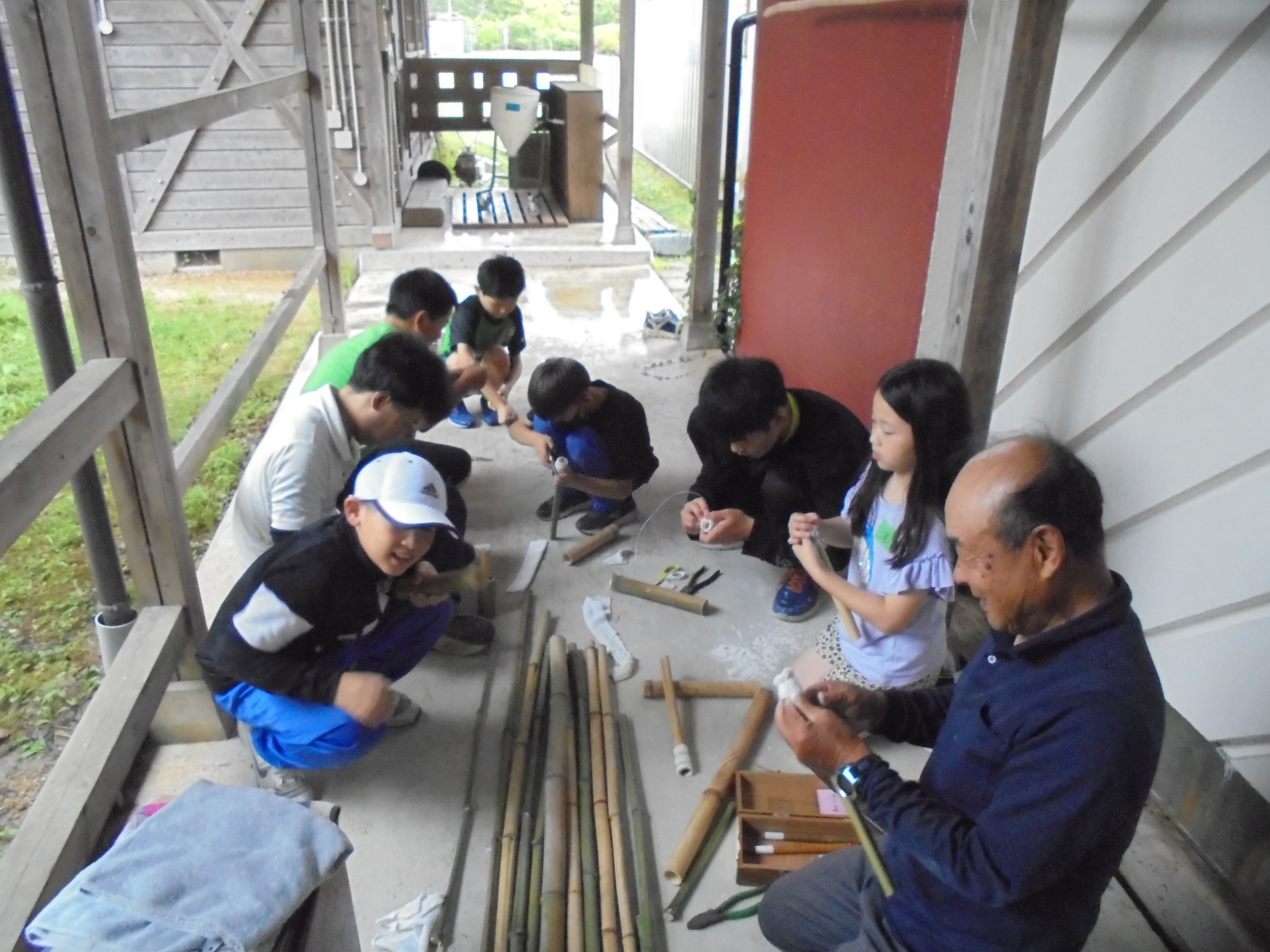 【昔遊び】 竹を切って水鉄砲を作りました。タオルの巻き加減で水の出方が変わります。